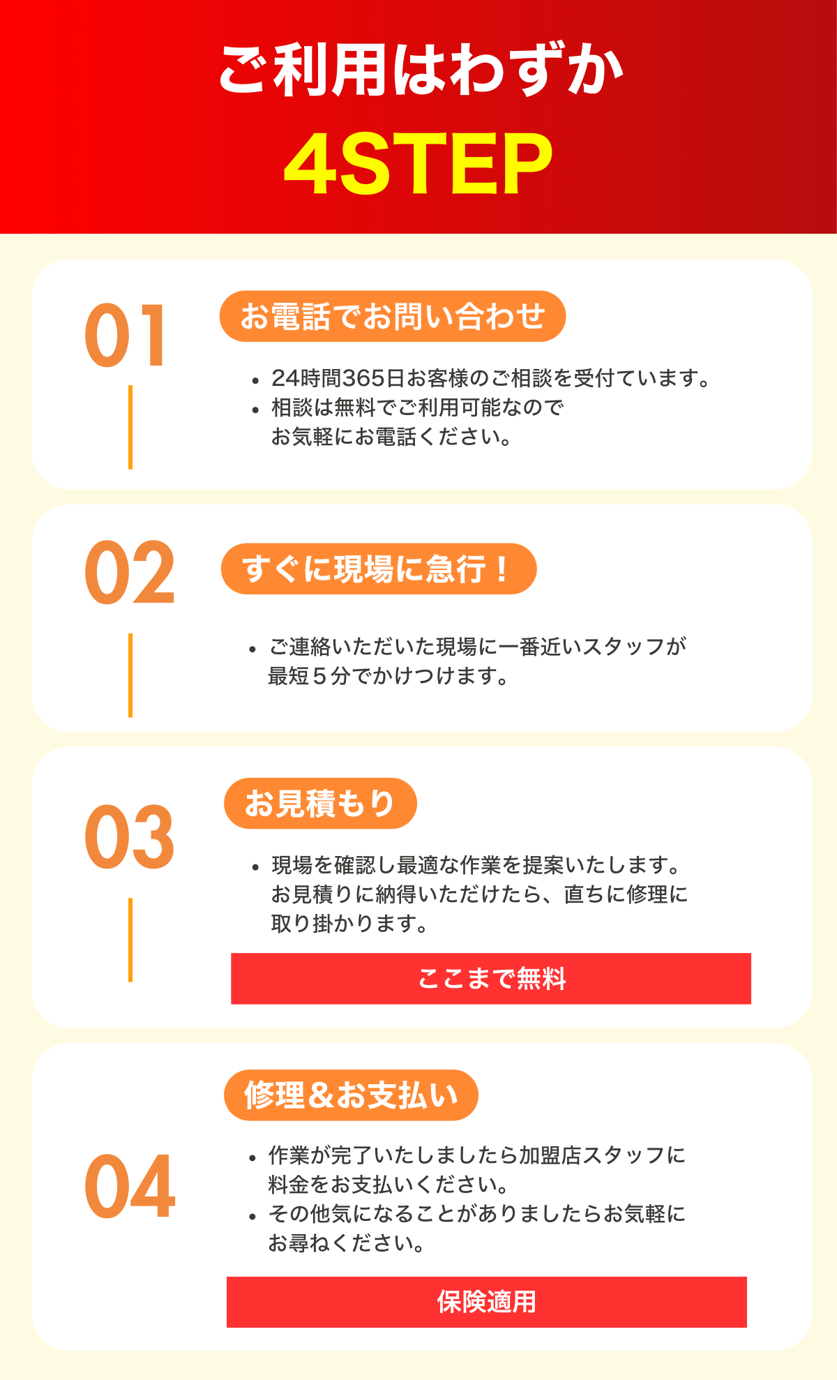 当社は見積もり・出張費・深夜料金が完全無料。明確な料金をご案内後、納得いただいたうえで修理開始。見積もり後の追加費用は一切ございません。そのため、ロードサービスの利用が初めてで不安な方から選ばれています。また、修理内容が保険適用の場合、後から保険で清算することも可能なため実質ご負担は0円。安心してお車を直すことができます。