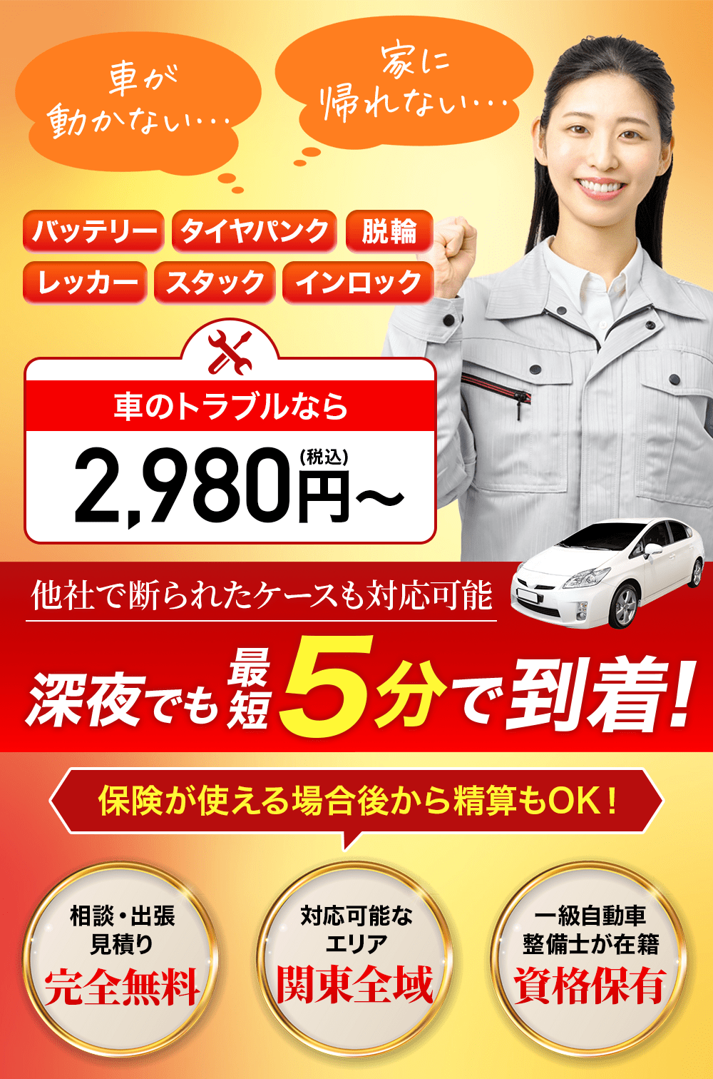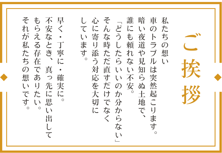 対応できないと断られてしまった、レッカー手配できるのが明日と言われる、自宅に帰らないと手持ちがなくて断られた。そんな状況でもご安心ください。当社は一級自動車整備士をはじめとした経験豊富な修理のプロが、お客様の状況に合わせて柔軟にきめ細かい対応を致します。また、レッカー移動できると言われても同乗することができず、お客様は別手段で移動となってしまい不要なお金と時間がかかってしまうケースでも、当社なら同乗が可能なので費用と時間の節約にもなります。