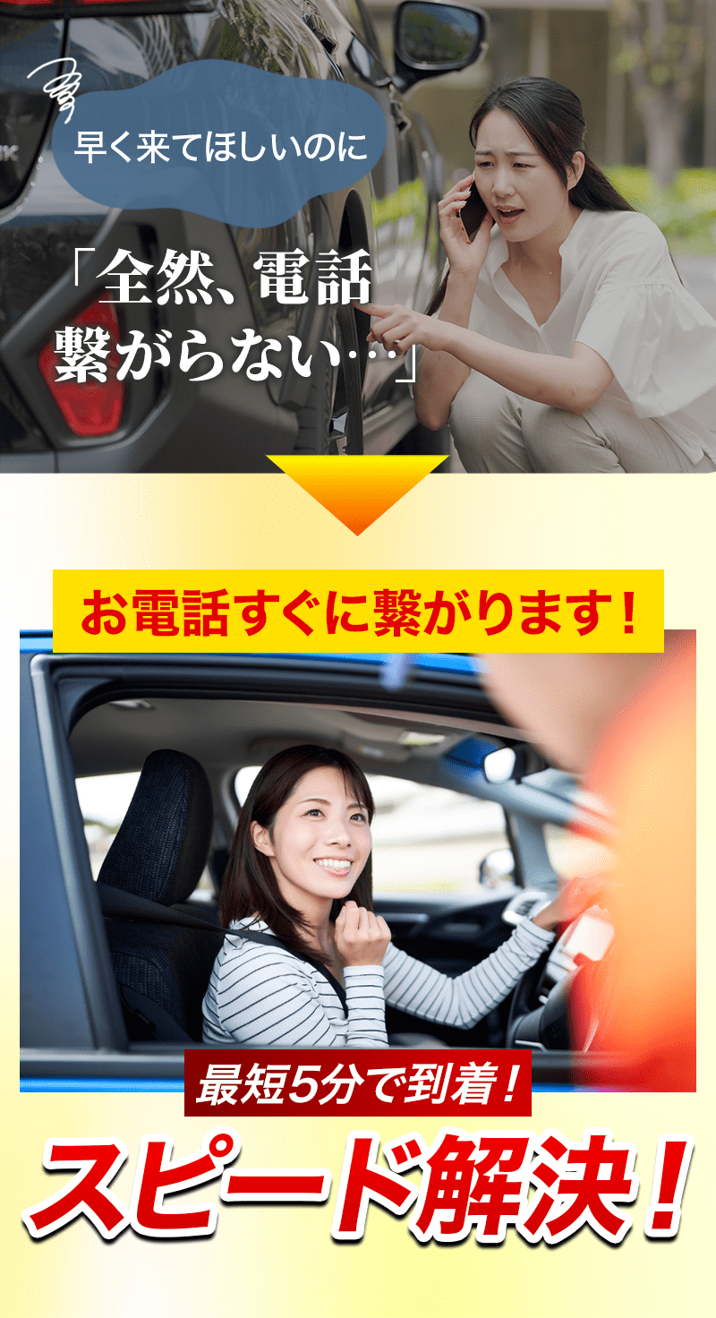保険会社や他社は到着に3時間かかると言われたケースでも、当社ならトラブルが起きたその場所・深夜帯などの時間・休日祝日に関係なく最短5分で駆けつけます。「早く家に帰りたい」「交通量の多い道路で止まってしまって困っている」その声に応えます。